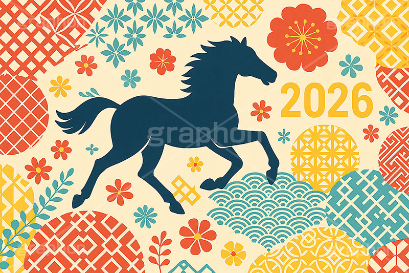 キーワード 午年シンプルイラスト, 和柄, 花柄, 馬イラスト, , , うま, ウマ, 午年, 干支, 正月, お正月, 年賀状, 2026午年, 2026, 午年年賀状, 新年, シルエット, ニューイヤー, アニバーサリー, イラスト, illustration, japan, horse, silhouette,
