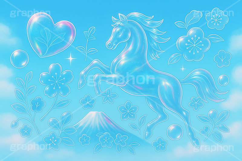 キーワード ガラスの馬, ガラス, ガラス細工, 馬イラスト, , , うま, ウマ, 午年, 干支, 正月, お正月, 年賀状, 日の出, 初日の出, 富士山, , 青空, 2026午年, 午年年賀状, 新年, 爽やか, ニューイヤー, アニバーサリー, イラスト, 派手, ハート, ラブ, illustration, japan, horse, glass, sky, heart,