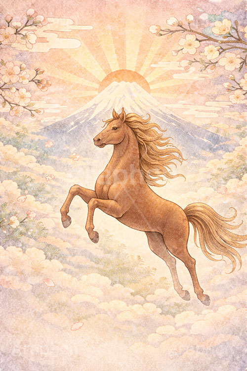 キーワード 初日の出(午年), 馬イラスト, , , うま, ウマ, 富士山, 初日の出, 日の出, 午年, 干支, 正月, お正月, , 梅の花, 水彩, 水彩画, 年賀状, 2026午年, 午年年賀状, 新年, ニューイヤー, アニバーサリー, イラスト, illustration, japan, horse,