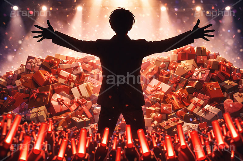 キーワード 推しへのチョコレート, バレンタインデー, バレンタイン, チョコレート, プレゼント, 贈り物, 山積み, たくさん, サイリウム, ペンライト, アイドル, イケメン, ライブステージ, ステージ, 推し, 推し活, 舞台, ライブ, ライヴ, コンサート, シアター, ホール, 背景, 照明, 音楽, 主役, 人物, 男性, , ミュージック, ライト, スポットライト, イラスト, illustration, light, frame, hall, theater, live, stage, music, chocolate, valentine, present, AI生成素材,