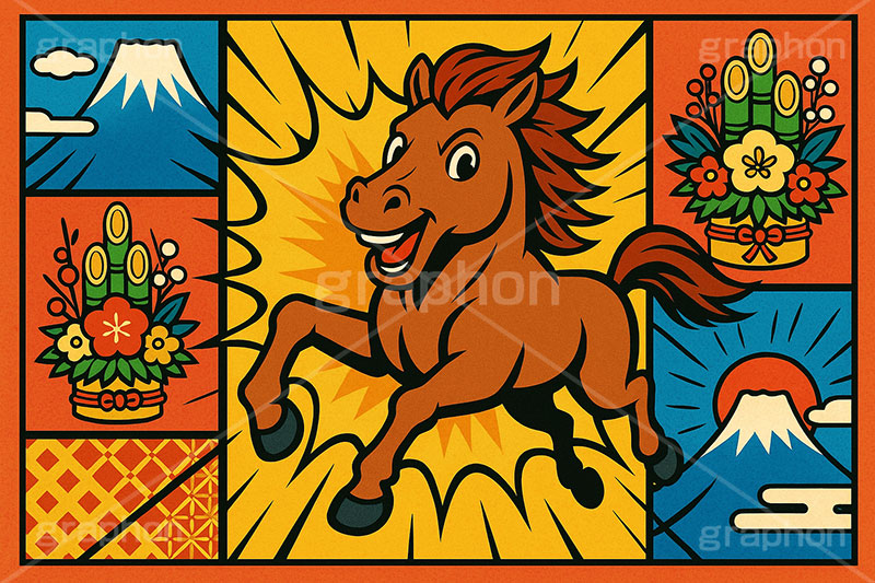 キーワード 午年イラスト(アメコミ風), アメコミ, コミック, 漫画, マンガ, まんが, 富士山, 初日の出, 日の出, 門松, 馬イラスト, , , うま, ウマ, 午年, 干支, 正月, お正月, 年賀状, 2026午年, 午年年賀状, 新年, ニューイヤー, アニバーサリー, イラスト, illustration, horse,