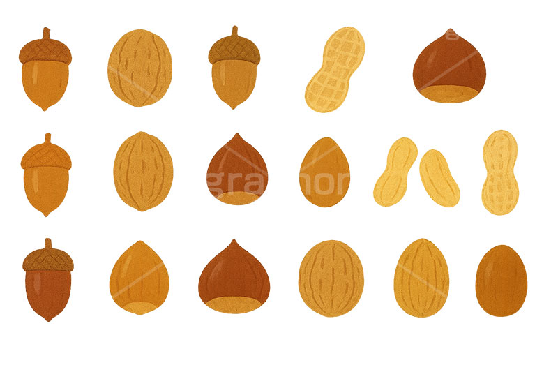キーワード 木の実セット, くり, クリ, , どんぐり, ドングリ, 団栗, 木の実, クルミ, くるみ, ナッツ, 秋の素材セット, , イラスト, セットイラスト, セット, 手描き風, illustration, autumn,