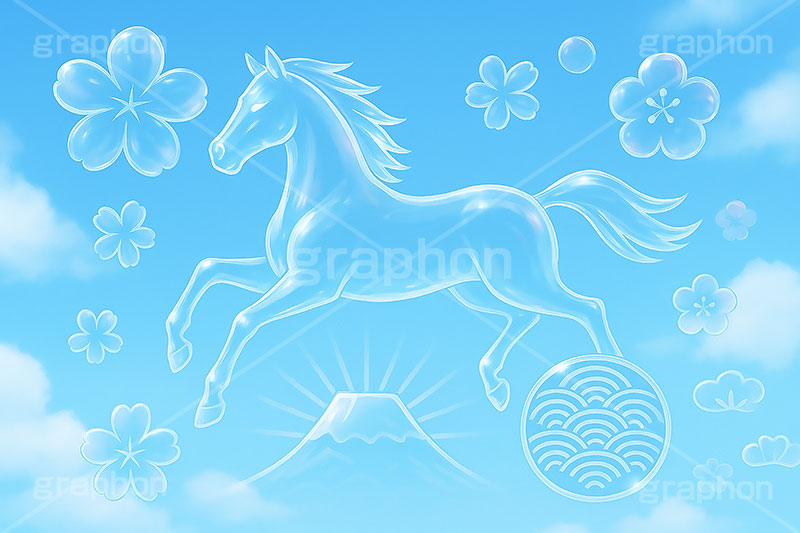 キーワード ガラスの馬, ガラス, ガラス細工, 馬イラスト, , , うま, ウマ, 午年, 干支, 正月, お正月, 年賀状, 日の出, 初日の出, 富士山, , 青空, 2026午年, 午年年賀状, 新年, 爽やか, ニューイヤー, アニバーサリー, イラスト, 派手, illustration, japan, horse, glass, sky,