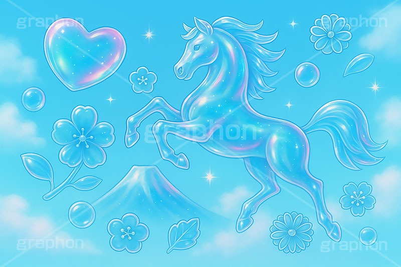 キーワード ガラスの馬, ガラス, ガラス細工, 馬イラスト, , , うま, ウマ, 午年, 干支, 正月, お正月, 年賀状, 日の出, 初日の出, 富士山, , 青空, 2026午年, 午年年賀状, 新年, 爽やか, ニューイヤー, アニバーサリー, イラスト, 派手, ハート, ラブ, illustration, japan, horse, glass, sky, heart,