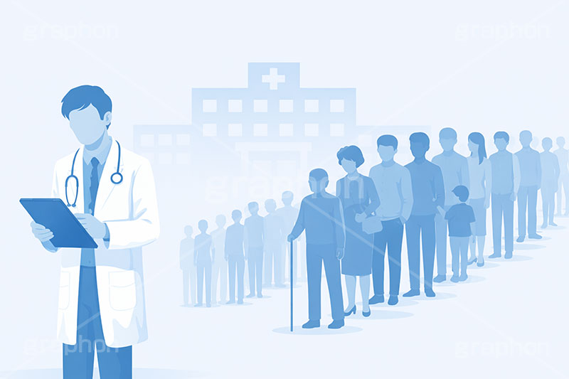 キーワード 医師不足, 人員不足, 行列, 殺到, 医療問題, 社会問題, 問題, 高齢化, 医師, 医療, 通院, 病院, 診察, 病室, ヘルスケア, ケア, メディカル, 健康, 人物, キャラクター, おじいさん, おばあさん, おじさん, おばさん, お年寄り, 高齢者, シニア, イラスト, illustration, healthcare, health, hospital, medical, AI生成素材,